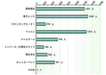 次いでテレビゲーム、ホットカーペットがおよそ3割、IHクッキングヒーターは2割弱。